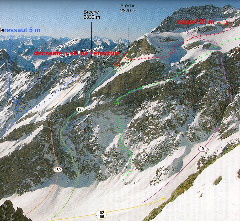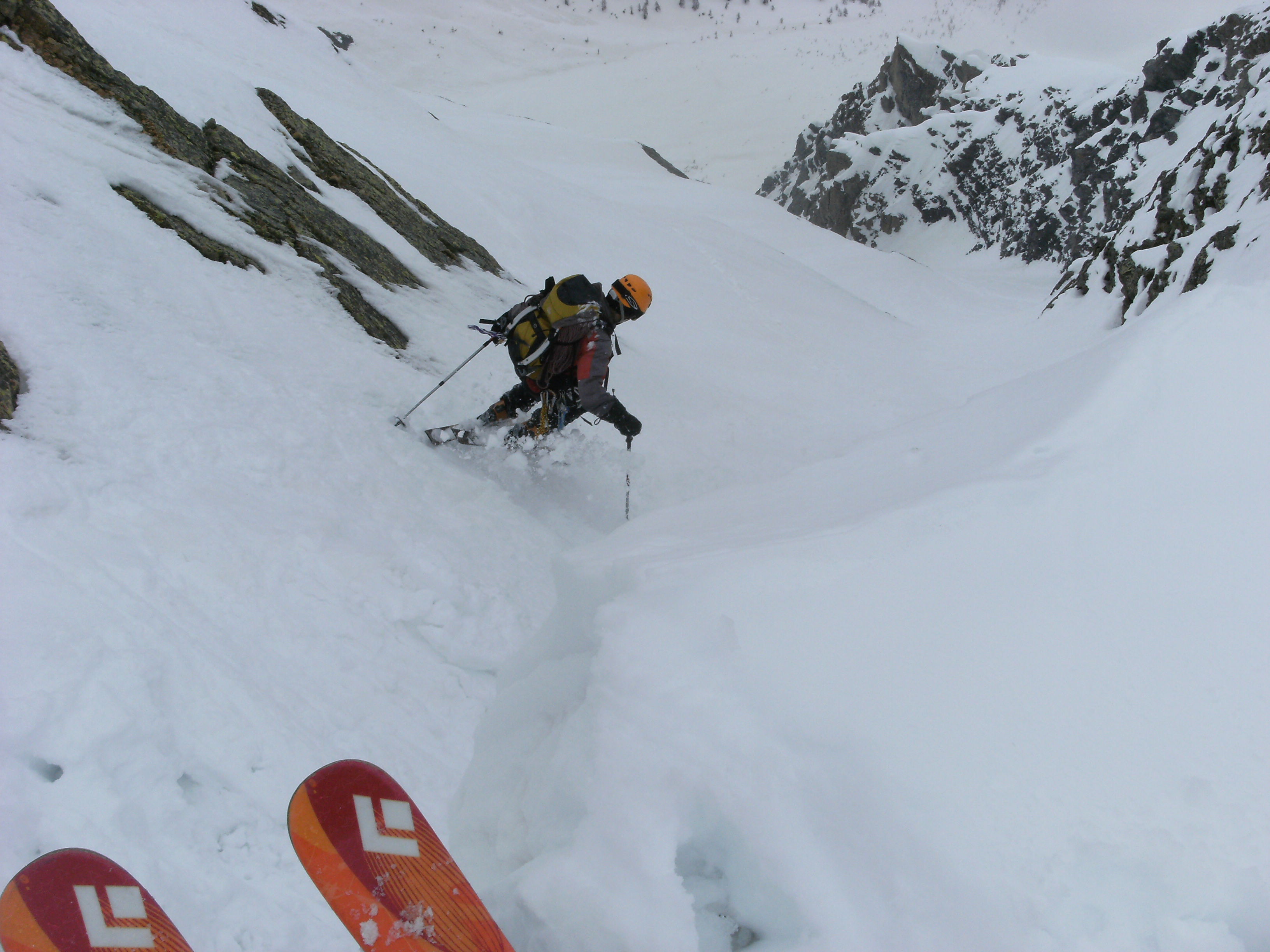 face nord du pic gardiner aux dome de monetier- 5.1 45°/50° AD- sur 250 m la face est peut enneiger mais la flemme l’a emporter et on a profiter des dernier jour d’ouverture de la station. la descente a nécessité un petit tout droit et 2 petit sauts mais la face peut s’enneiger beaucoup plus offrant de multiples choix de parcours.ensuite pour rentabiliser la journée on est remonter a une brèche par un couloir sud est (les nuages on limité le réchauffement) qui ramène dans les pentes au dessus de fantomas, on pensait arriver plus bas juste en haut des pentes (la ou sort l’itinéraire de fantomas sur ton topo ) mais on est arriver sur la crête un peut plus haut, le versant nord de notre brèche été barré par un ressaut rocheux qui a nécessité un rappel de 20 m.