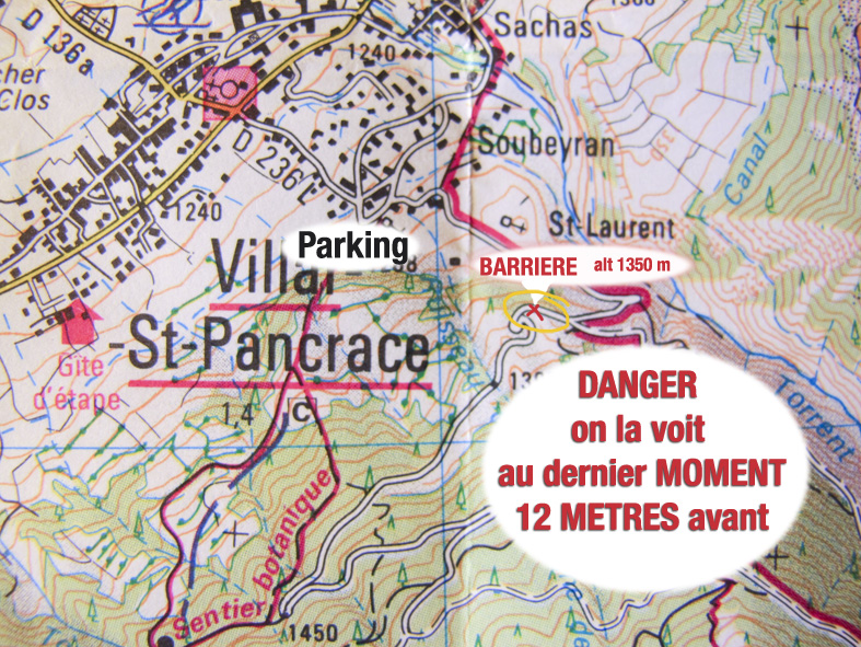 le plus DANGEREUX c’est qu’à la DESCENTE on l’aperçoit 12 mètres seulement avant de la percuter juste la sortie d’une croube à droite. Laissant un temps de REACTION quasi nulle même si l’on connaît le piège.