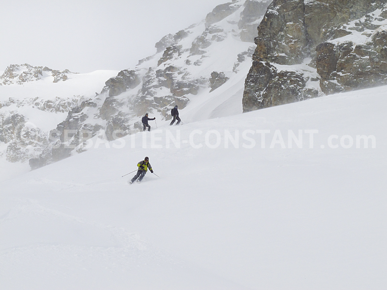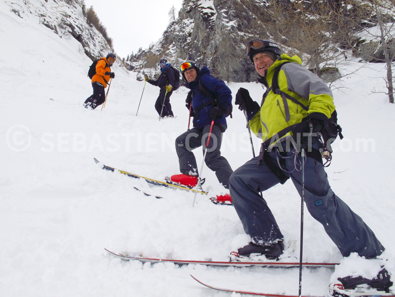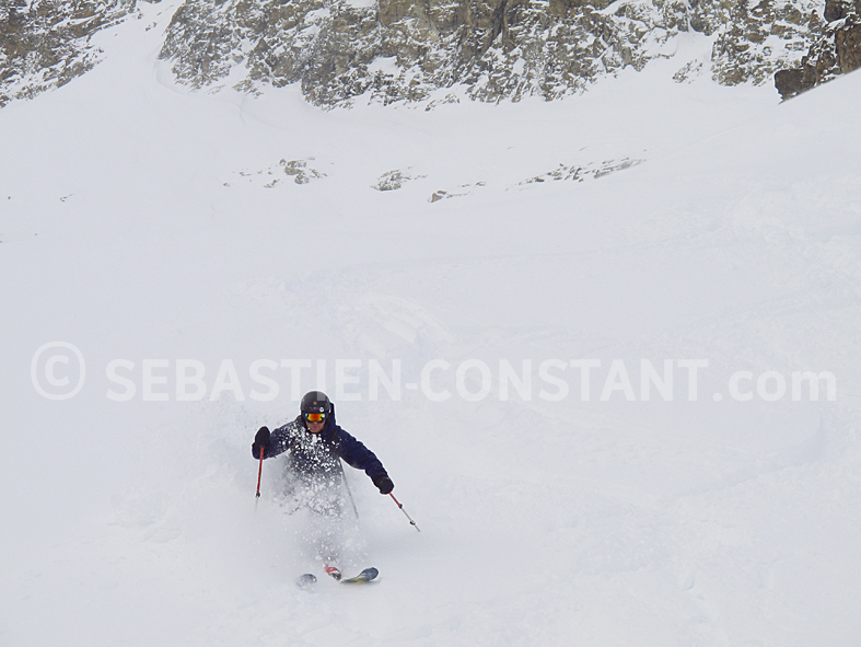 In the couloir, everybody focus on in his technique. For the safety, we ski one after one in the technical parts and I stay below the team as a goal ready to arrest the “Ball”. I may be able to stop a fall, or a slide, if the snow is not too hard, and if the skier doesn’t take too much speed.