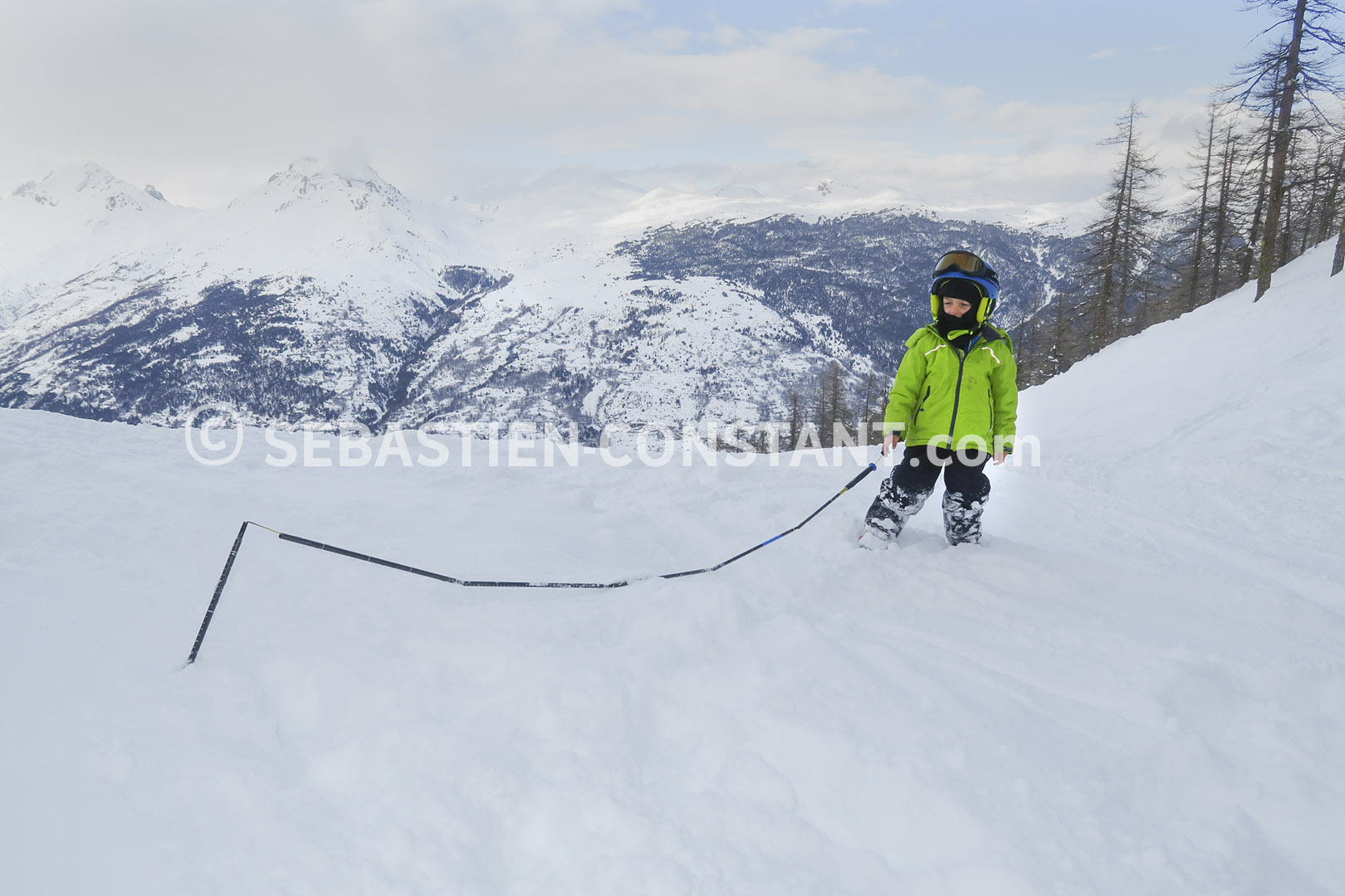 Une façon très originale et rusée de monter sa sonde : en plantant l’extrémité dans la neige puis en se reculant pour mettre les tubes dans l’axe. Il ne reste plus qu’à mettre en tension la ficelle/câble pour assembler le tout. A la fin de la mise en tension l’extrémité de la sonde sort de la neige. Et voilà le tour est joué !